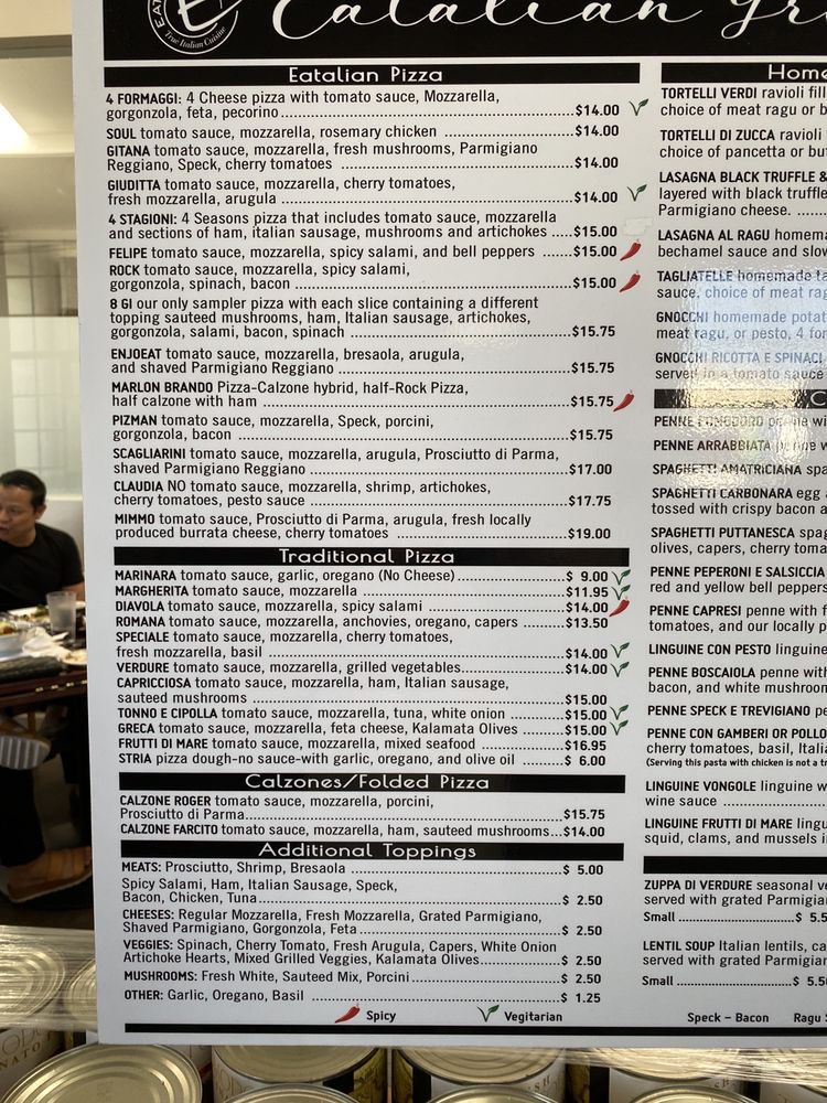 Introducing the menu at Eatalian, located in Gardena, California, specializing in Italian pizza. The diverse menu includes traditional options like Marinara and Margherita pizzas, as well as unique creations like the Rock Pizza with spicy salami and Gorgonzola. Customers rave about the quality of the food, especially the delicious pizzas. The industrial ambiance may not be for everyone, but the standout dishes make up for the unconventional setting. With options for vegan and vegetarian diners, Eatalian offers something for everyone. Be sure to try their appetizers, like the Insalata di Mare Octopus, shrimp, and more, for a flavorful start to your meal. Don't miss the opportunity to experience the best pizza in Southern California at Eatalian.